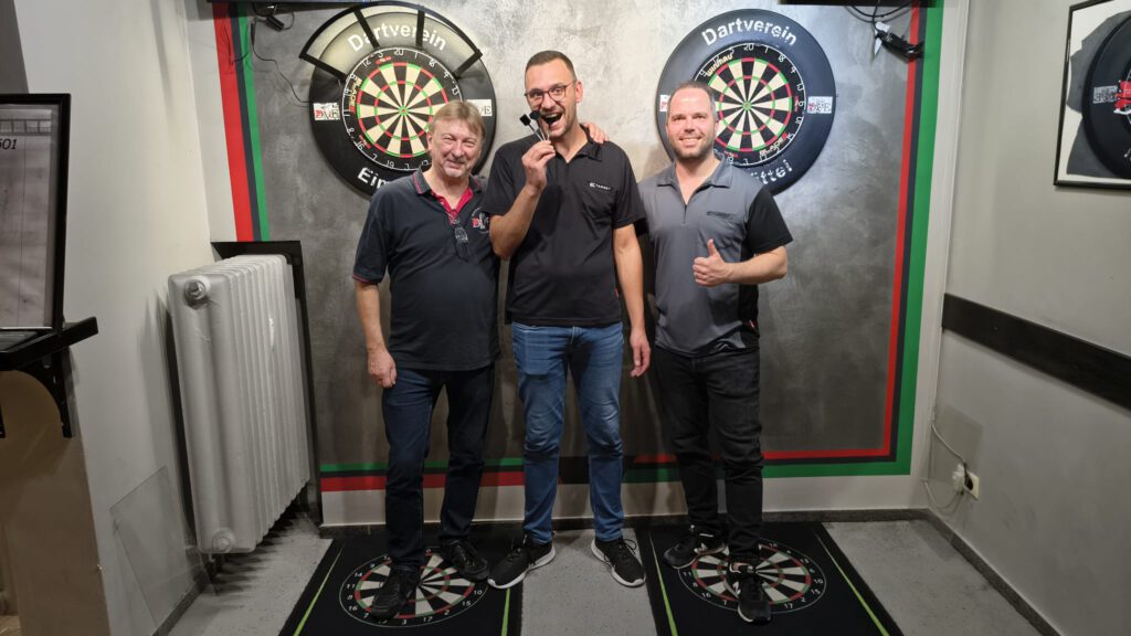 27 Teilneher hatten wir am Freitag zu verzeichnen. Wir spielten in 8 Gruppen und hatten dann ein 16 DKO-Feld bestimmt und eine B-Runde mit Einfach-KO. In der A-Runde waren in der finalen Phase fast nur Decider anzusehen. Im Endspiel der Gewinnerseite gab es ein 3:2 für Eric gegen Richie. Richie hatte im Endspiel der Verlierer dann mit 3:2 das Nachsehen gegen Barnie, den er vorher durch ein 3:2 in die Verliererrunde geschickt hatte. Im Endspiel verlor Barnie dann knapp gegen Eric 3:2. Also Podestreihenfolge: Eric, Barnie, Richie, Stefan und den 5ten Platz teilten sich Adem und Schmitti. Bestes Shortleg spielte Schmitti mit 14 Darts, höchstes HF war von Eric mit 119 über Bull, bestes AVG und 2 HS von Richie und Barnie spielte 9 Shortlegs. In der B-Runde siegte Alex mit 3:2 gegen unsern Mister Decider Matthes. Herzlichen Glückwunsch an die Gewinner!